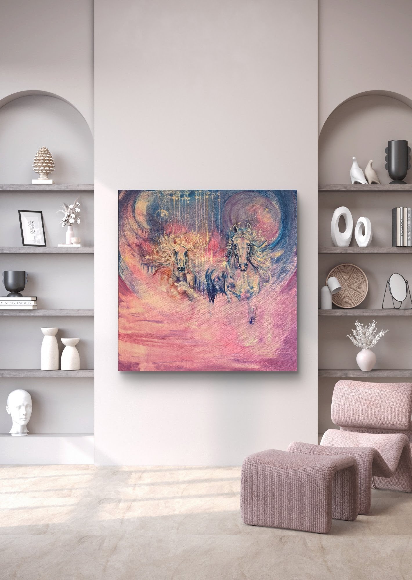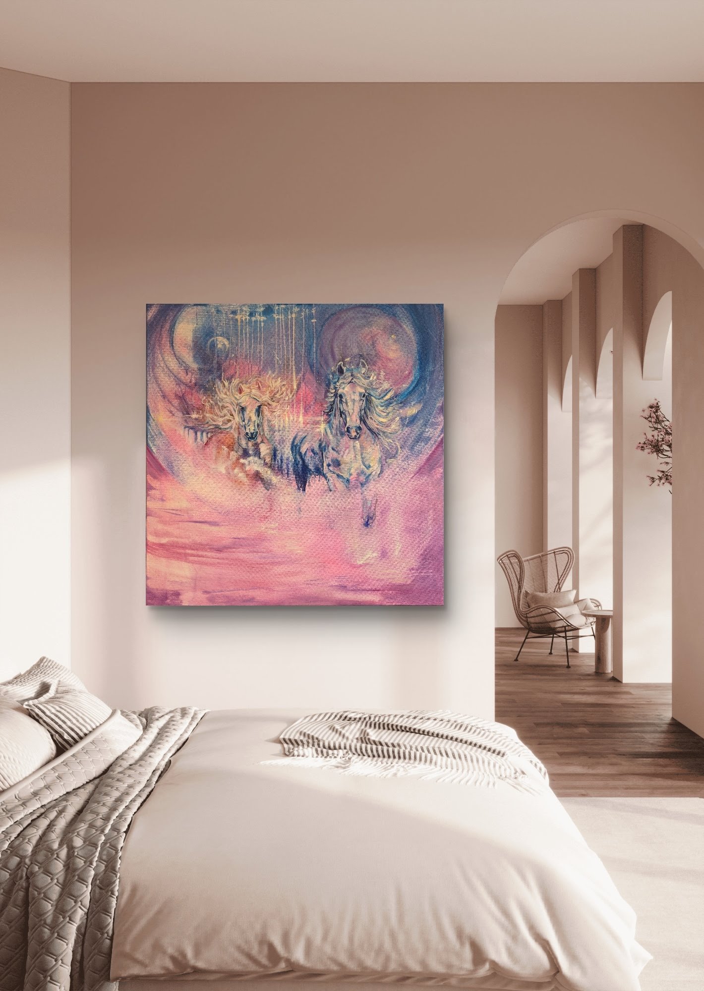Krachtig, vrij en vol zelfvertrouwen betreden de paarden deze wereld – symbolen van beweging, bewustzijn en verbondenheid. Ze herinneren ons aan onze eigen oerkracht en de vrijheid om grenzen los te laten, zowel buiten onszelf als in onszelf. Dit werk is ontstaan vanuit pure beweging: dansen met het doek, geleid door intuïtie en emotie. Het beeld nodigt uit tot groei, spel en diepe verbinding – met jezelf en met anderen. Een kunstwerk dat niet alleen de ruimte vult, maar ook het hart raakt en in beweging zet.